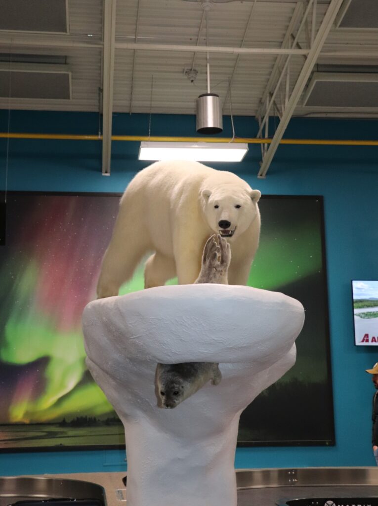 ターミナルビルにはシロクマ君がいた。小さな小さな空港だ。ここで-60℃対応のマングースの防寒具が支給された。とにかく、デカくて重い。両手はミトンだ。顔も隠れる。口も閉ざされて、コミュニケーションもとれない。だから、誰が誰だか識別不能となる。そこで名前をローマ字で背中と胸に貼る。